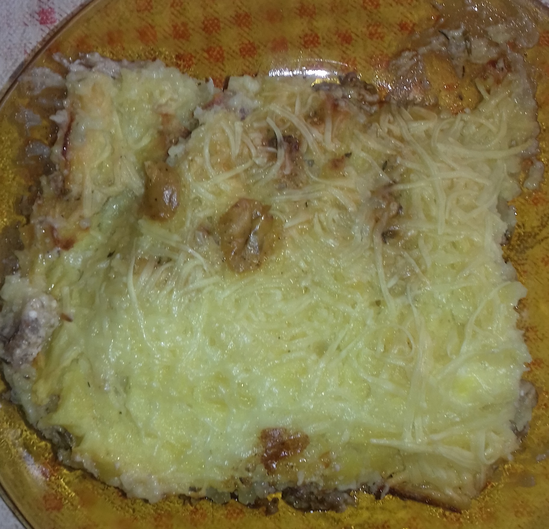 Dans un plat à four mettre de la purée au fond du plat, ajouter le contenu de la poêle et étaler sur la purée, recouvrir la viande avec le reste de purée. Ajouter du fromage râpé et des morceaux de beurre.